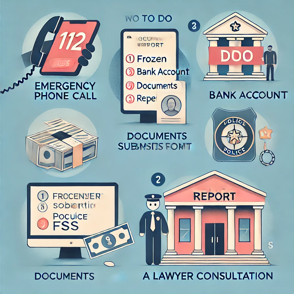 - 경찰서 방문 후 피해사실 신고서 작성 및 제출. 가능한 관련 문자, 녹취, 송금 영수증을 지참.